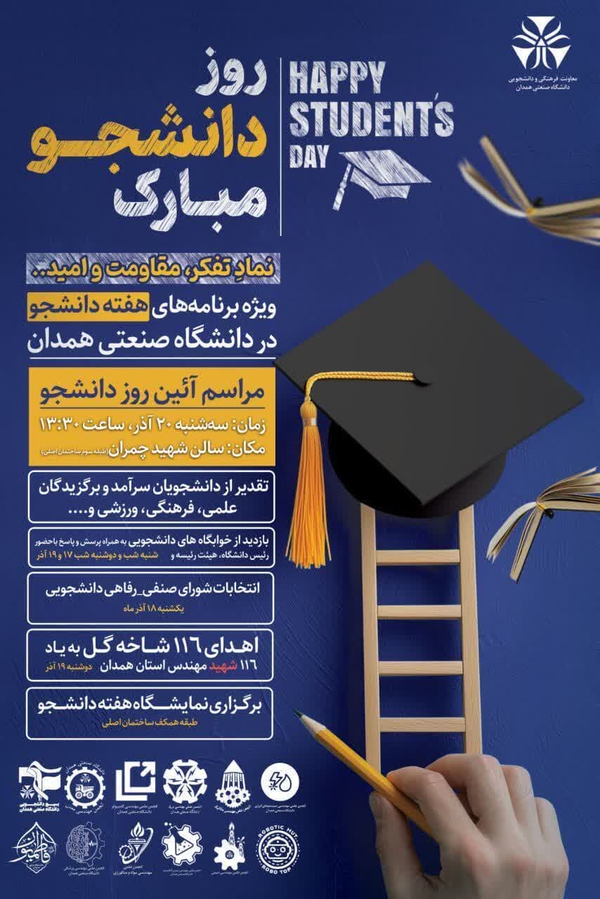 آئین روز دانشجو در دانشگاه صنعتی همدان با تقدیر از دانشجویان سرآمد و برگزیدگان علمی، فرهنگی، ورزشی و... برگزار میشود. این مراسم سهشنبه ۲۰ آذرماه، ساعت ۱۳:۳۰ در سالن چمران برگزار خواهد شد.