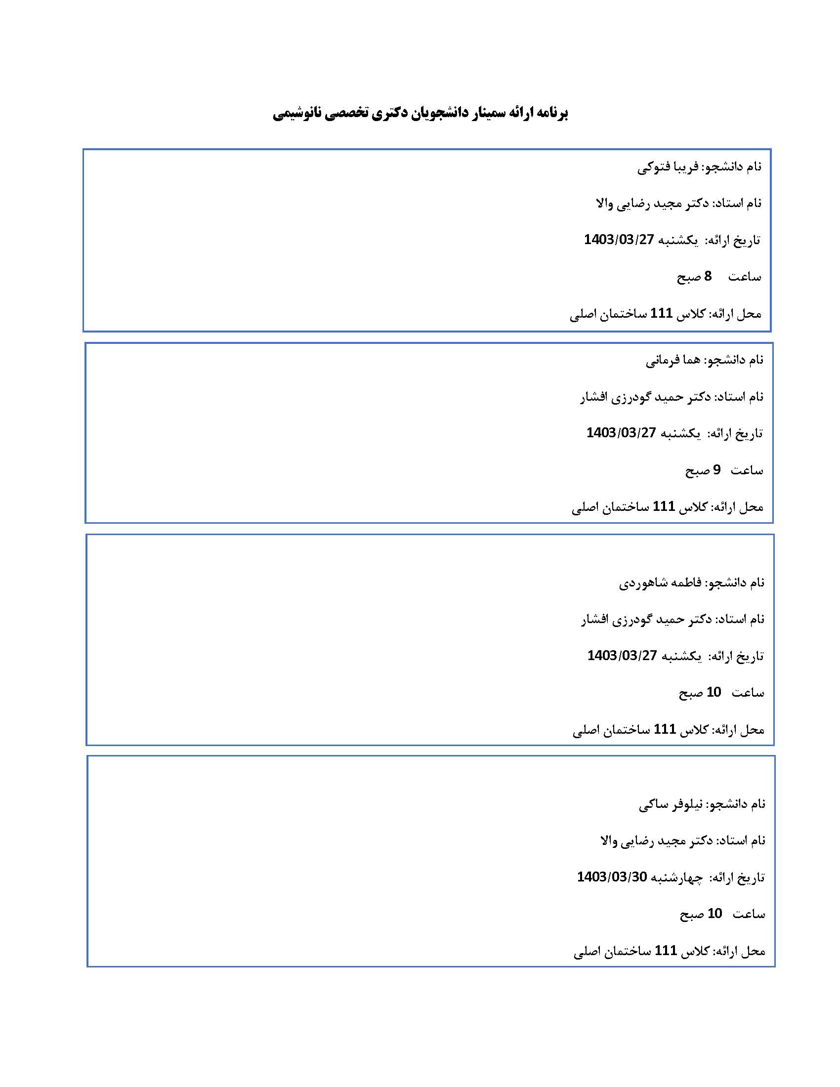 اطلاعیه ارائه سمینار دانشجویان دکتری تخصصی رشته نانوشیمی
