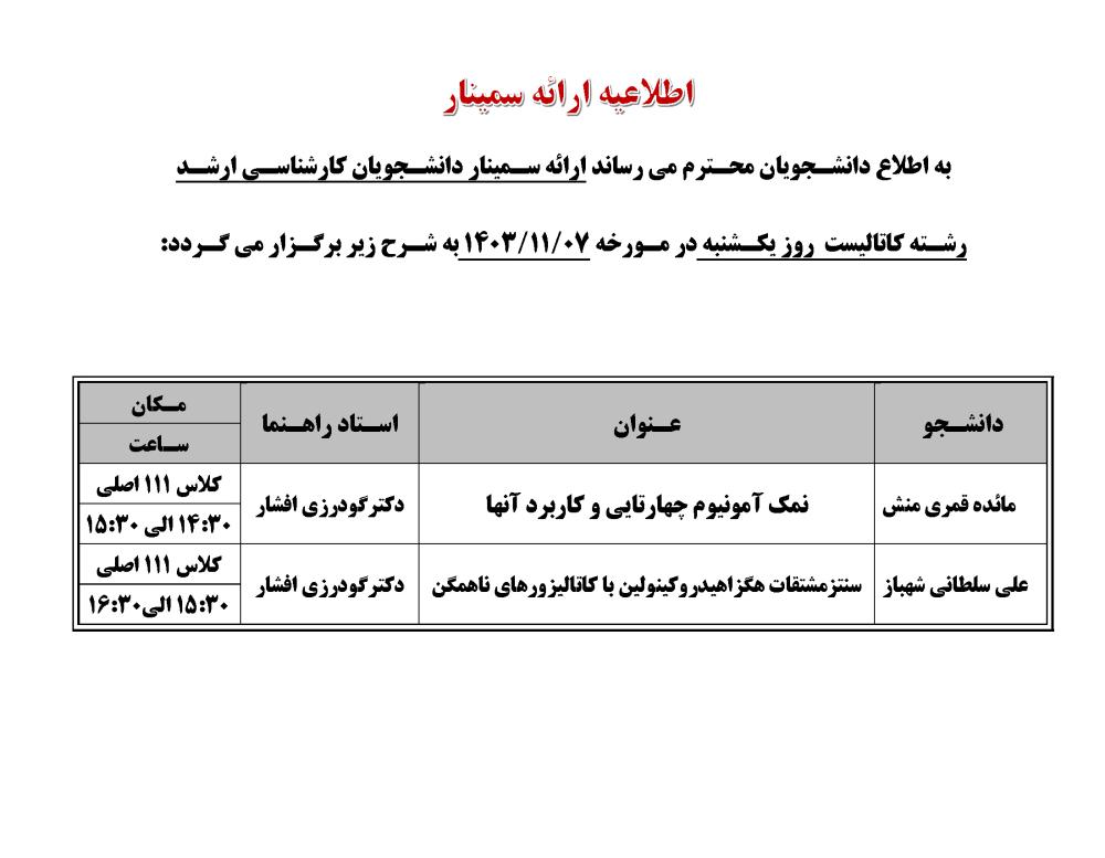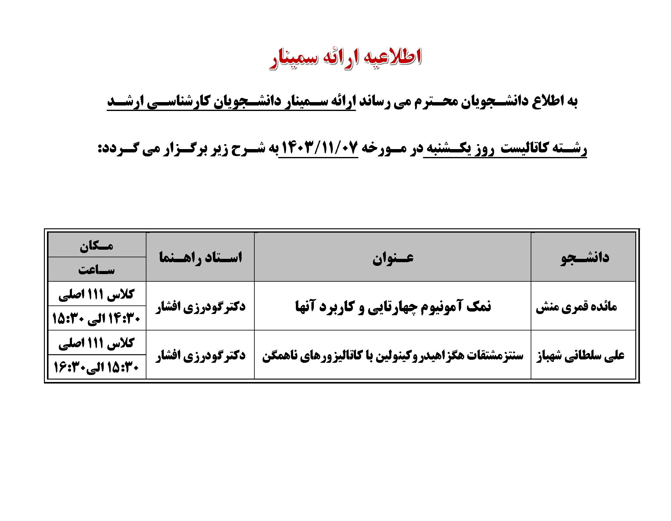 اطلاعیه ارائه سمینار رشته شیمی کاتالیست