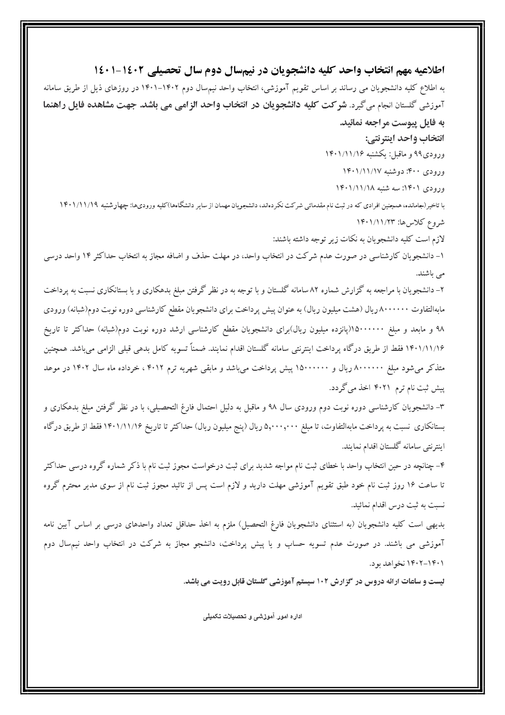 اطلاعیه انتخاب واحد ترم 4012
