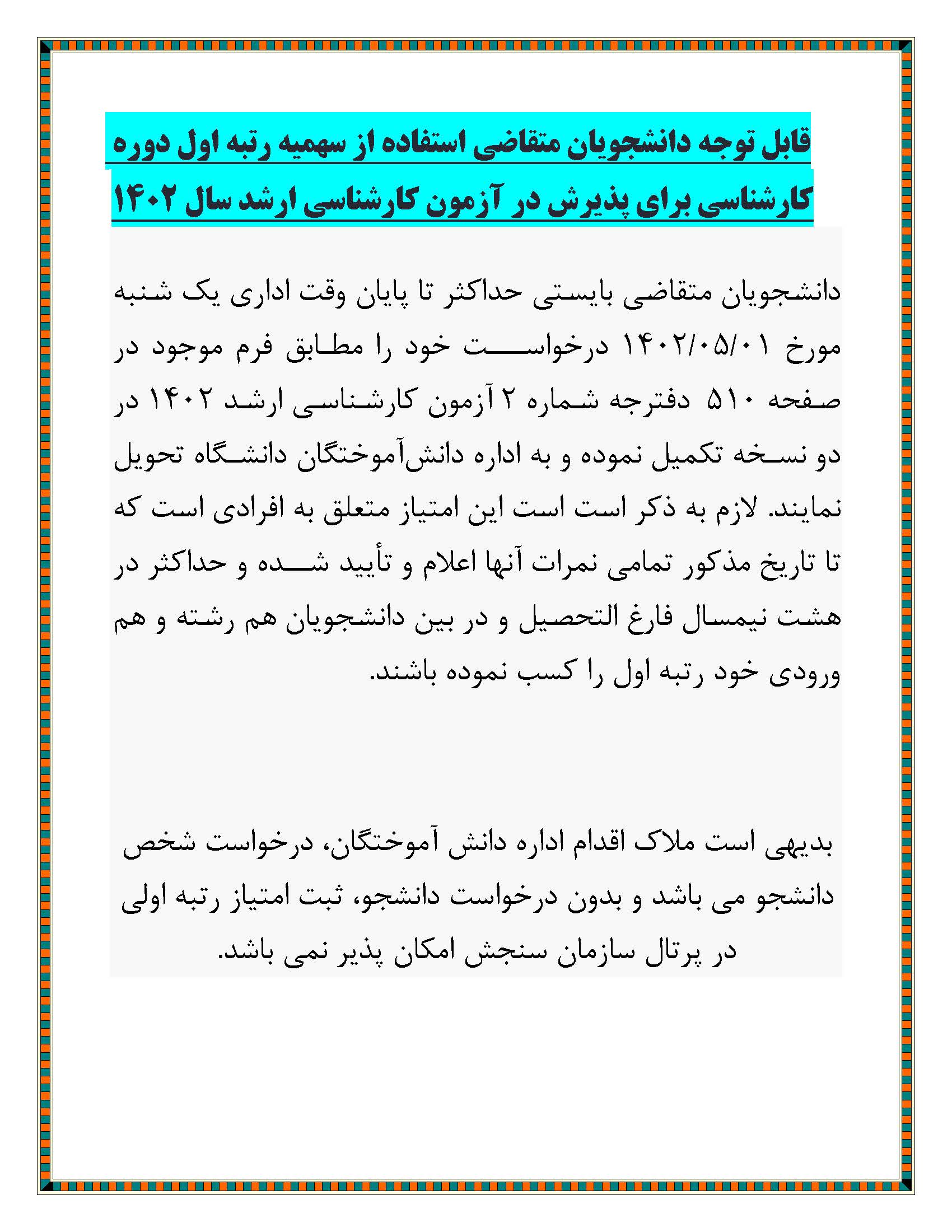 اطلاعیه دانشجویان متقاضی استفاده از سهمیه نفر اولی دوره کارشناسی برای پذیرش در کارشناسی ارشد