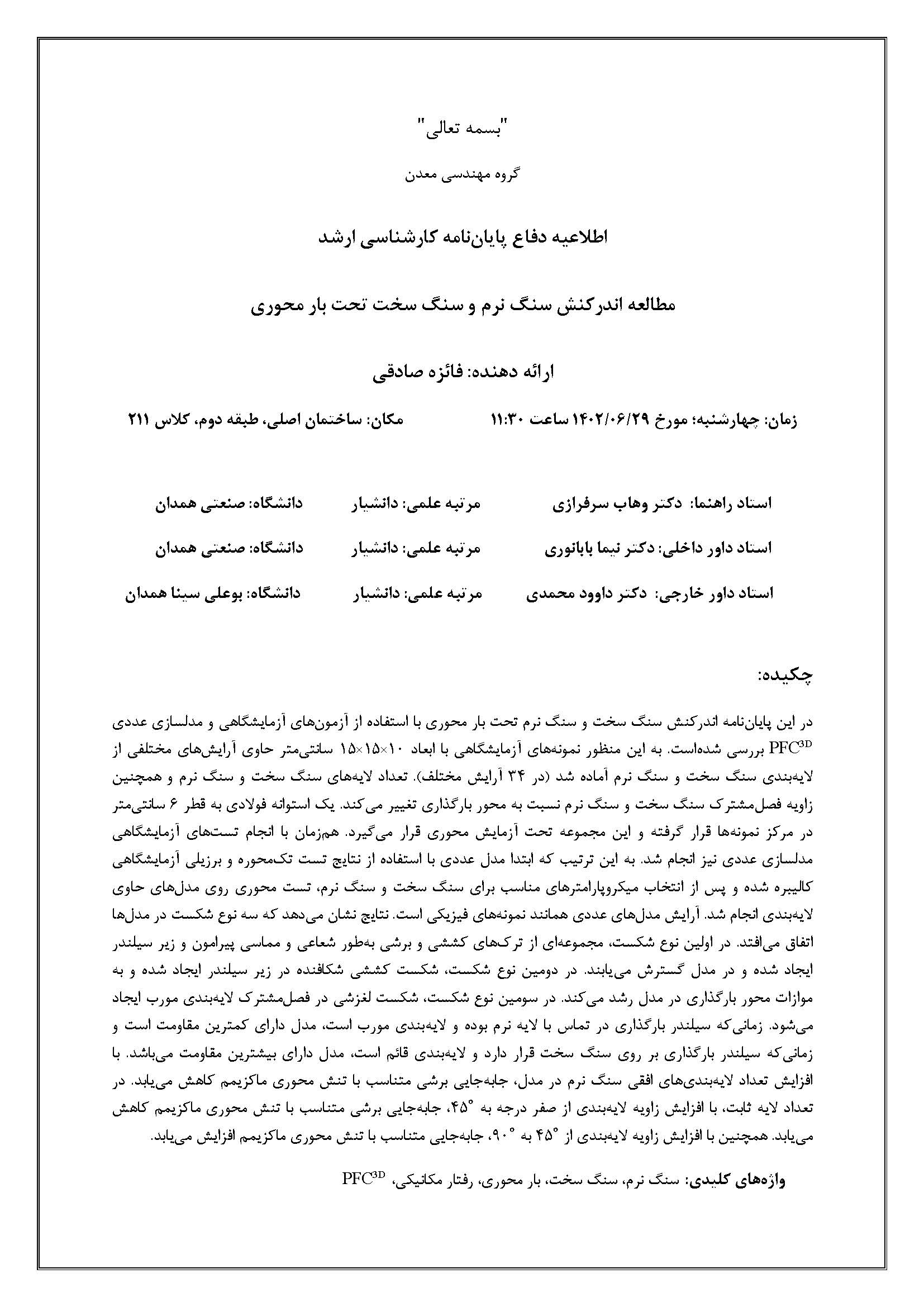 اطلاعیه دفاع دانشجوی کارشناسی ارشد- فائزه صادقی