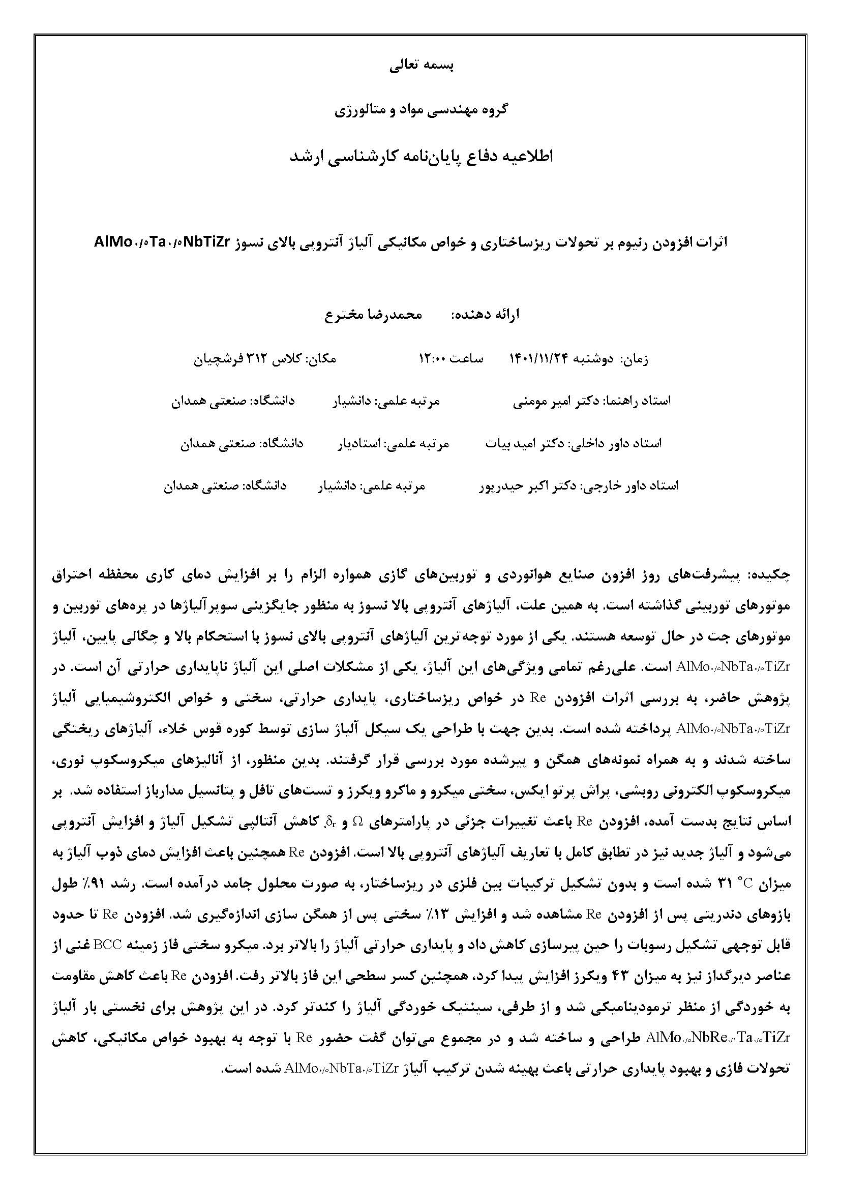 اطلاعیه دفاع دانشجوی کارشناسی ارشد محمدرضا مخترع