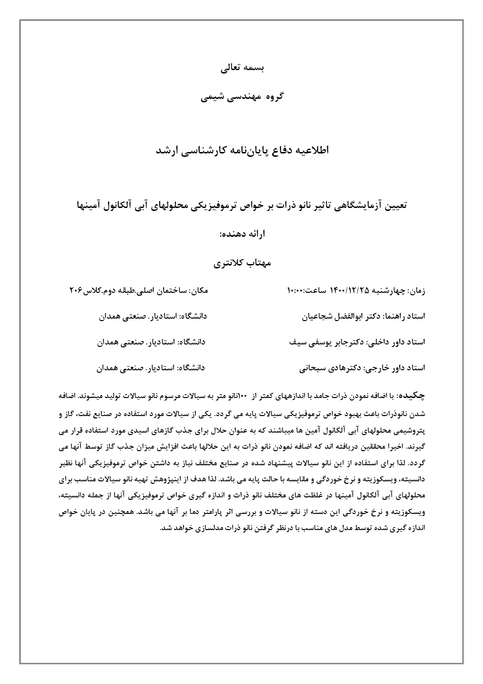اطلاعیه دفاع دانشجوی کارشناسی ارشد - مهتاب کلانتری