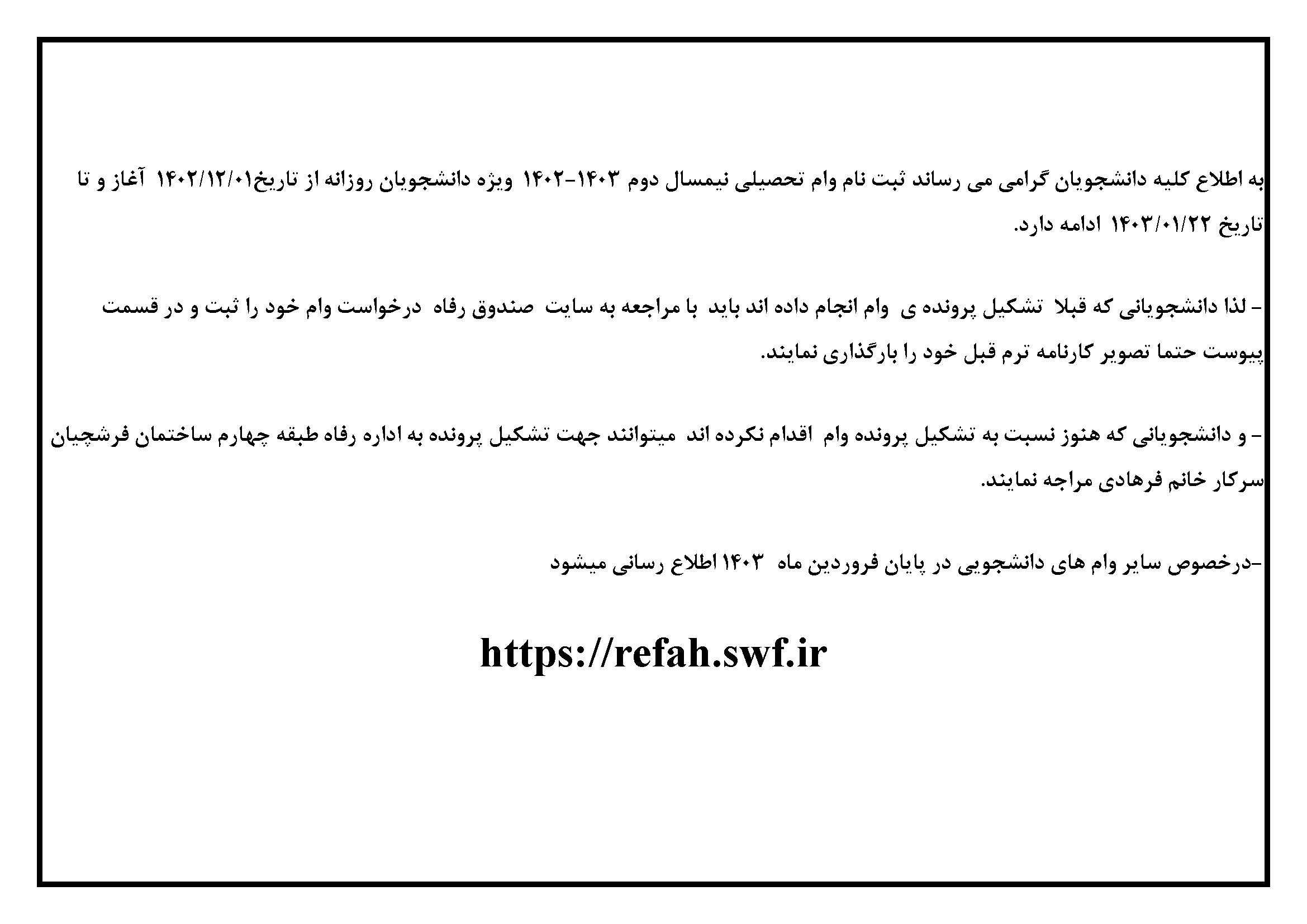 اطلاعیه وام های دانشجویی نیمسال دوم 1403-1402