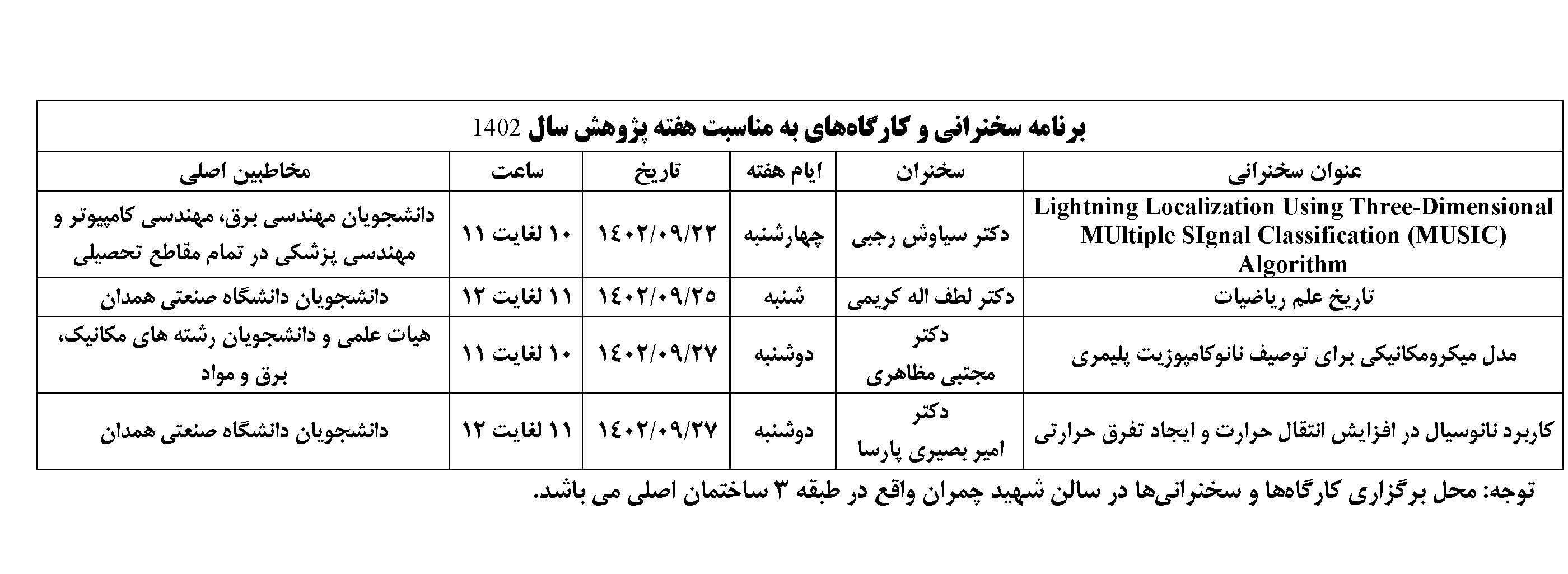 برنامه سخنرانی ها و کارگاه ها به مناسبت هفته پژوهش سال 1402