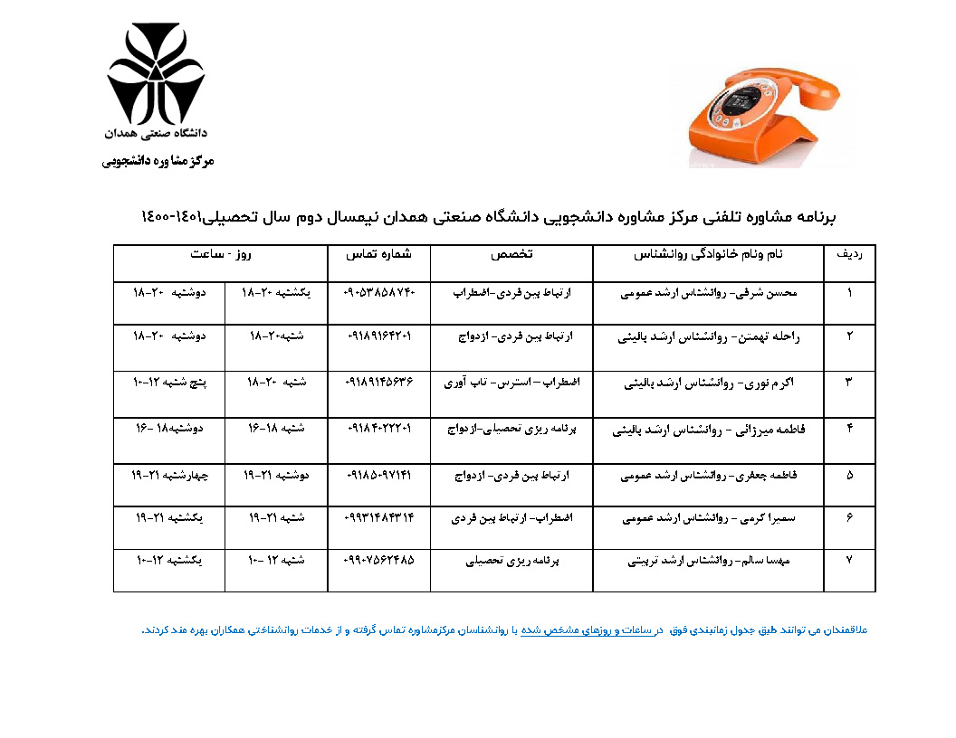 برنامه مشاوره تلفنی مرکز مشاوره دانشجویی دانشگاه صنعتی همدان نیمسال دوم سال تحصیلی1401-1400