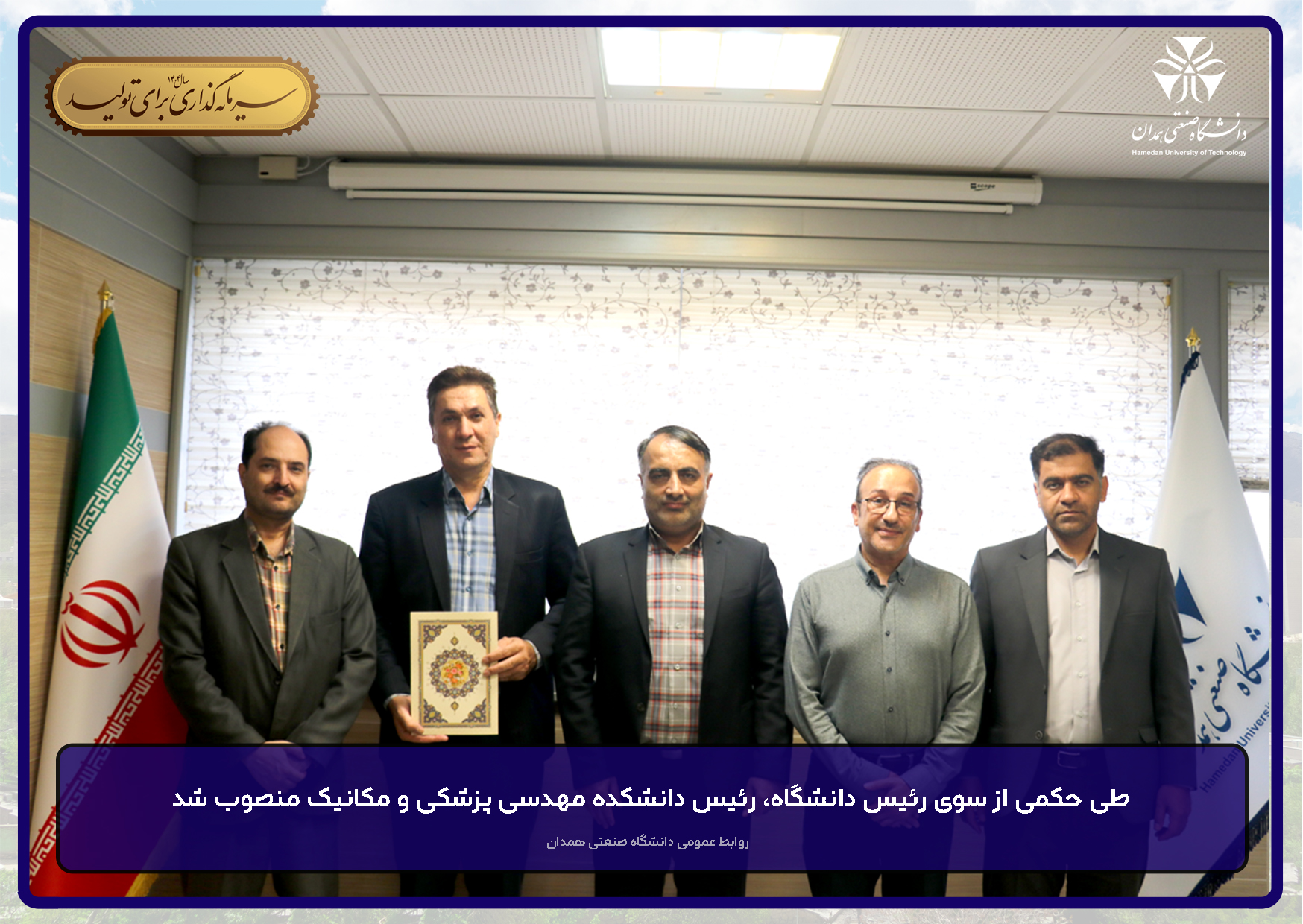 به گزارش دفتر روابط عمومی، طی حکمی از سوی دکتر محمود پری پور، رئیس دانشگاه صنعتی همدان، دکتر رسول باغبانی، عضو هیات علمی گروه مهندسی پزشکی، به سمت رئیس دانشکده مهندسی پزشکی و مکانیک منصوب شد.