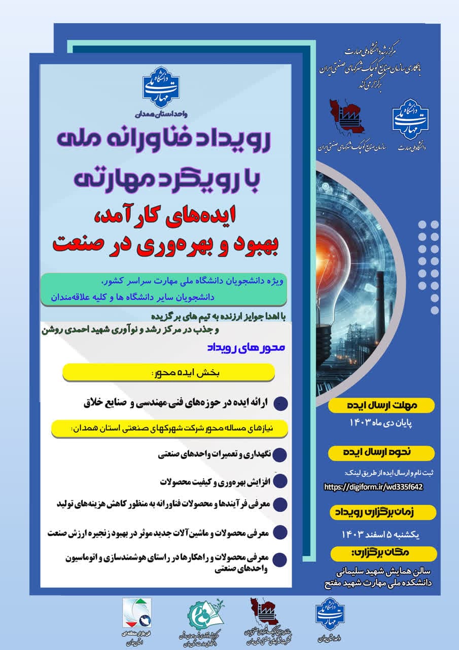 ✅ رویداد فناورانه ملی با رویکرد مهارتی ایدههای کارآمد، بهبود و بهرهوری در صنعت برگزار میشود.