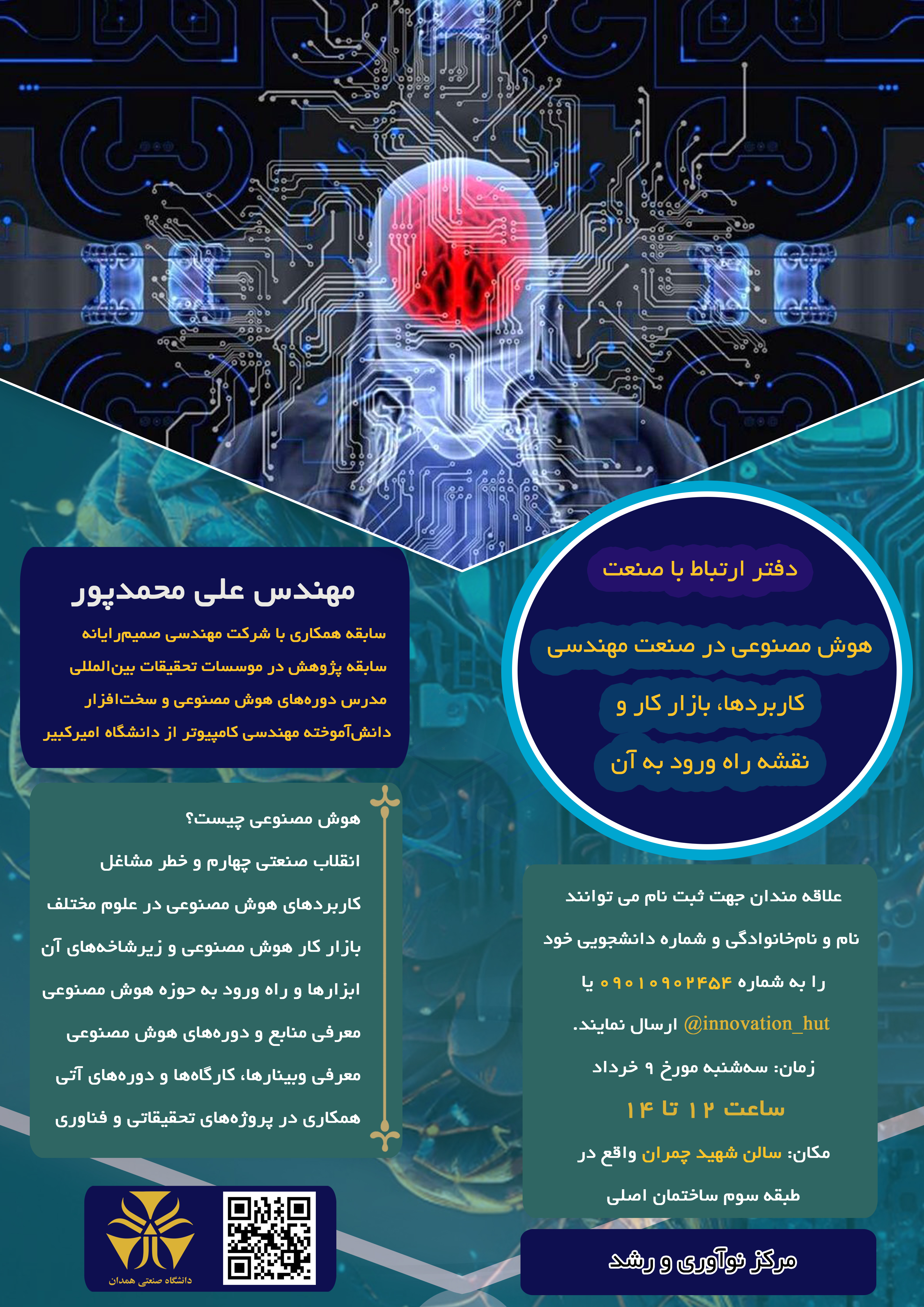 محوریت سمینار درباره معرفی کاربردهای هوش مصنوعی در صنعت مهندسی می باشد و با حضور و سخنرانی مهندس محمدپور برگزار می شود. شرکت در این سمینار برای دانشجویان تمامی رشتهها بسیار توصیه می شود. همچنین این سمینار کاملا رایگان می باشد و ثبت نام برای عموم دانشجویان گرامی آزاد است.