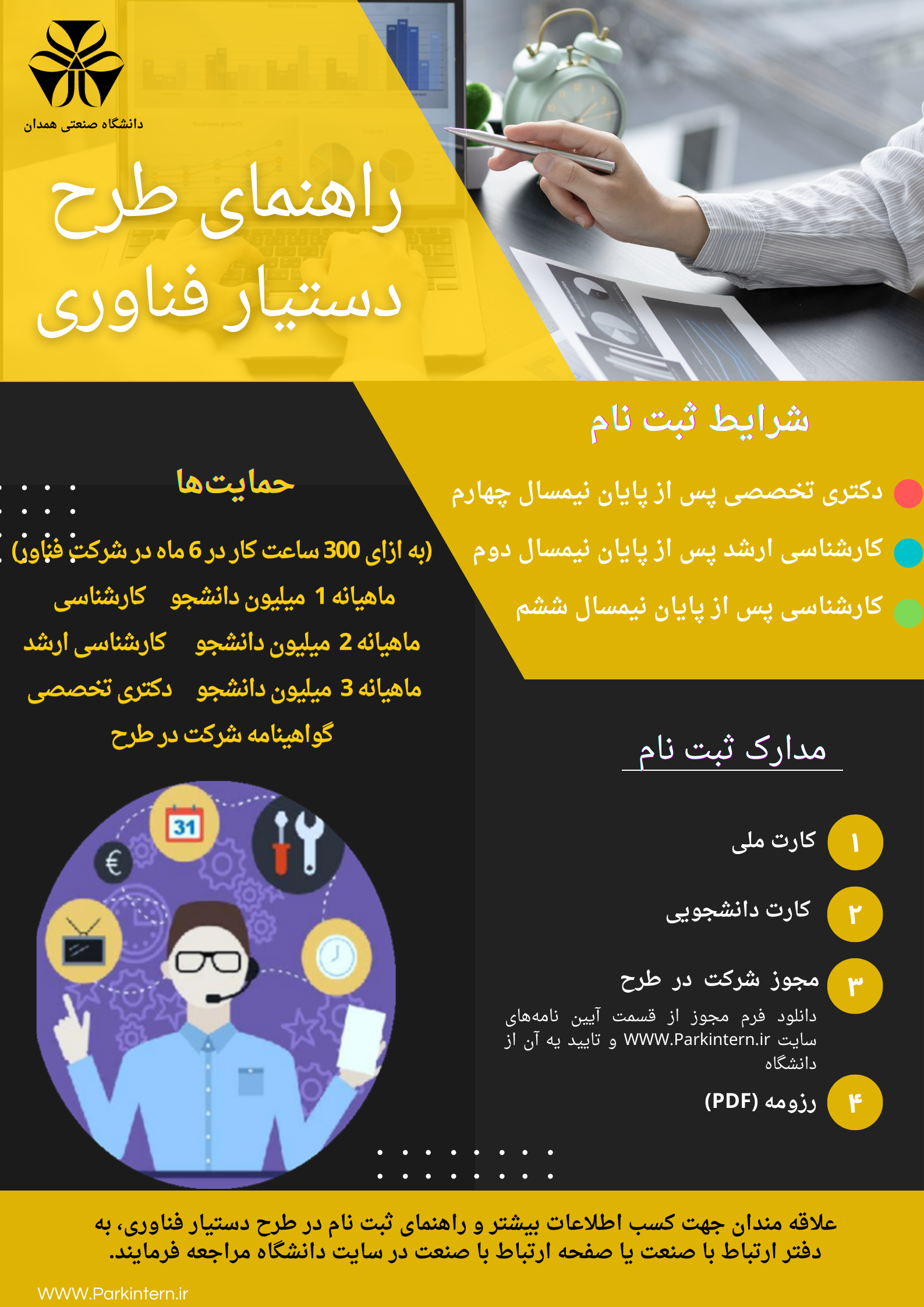 جهت کسب اطلاع از شرایط و نحوه ثبتنام در طرح دستیار فناوری، فایل راهنمای ثبتنام در طرح مطالعه شود.