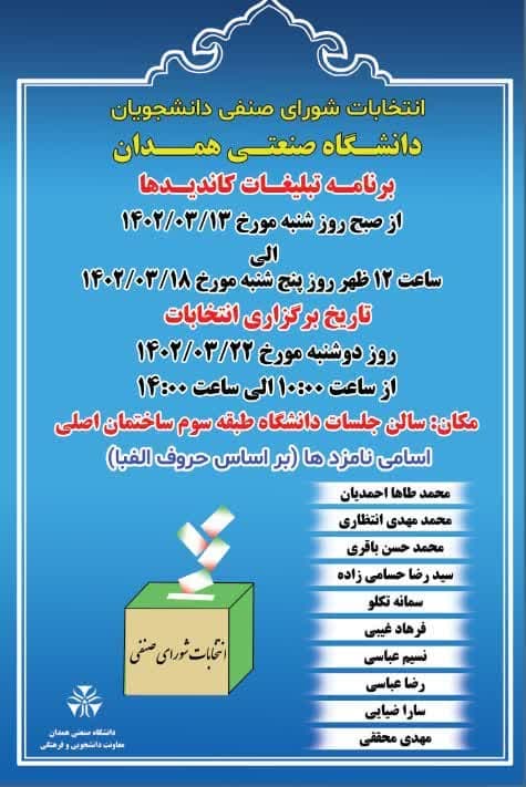 چهارمین دوره انتخابات شورای صنفی دانشجویان دانشگاه صنعتی همدان روز دوشنبه مورخ 22/03/1402 از ساعت 10:00 الی ساعت 14:00 برگزار می گردد.