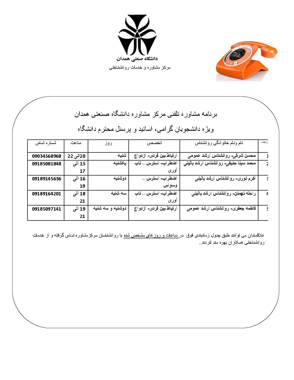 برنامه مشاوره تلفنی مرکز مشاوره دانشگاه صنعتی همدان – ویژه دانشجویان گرامی، اساتید و پرسنل محترم دانشگاه