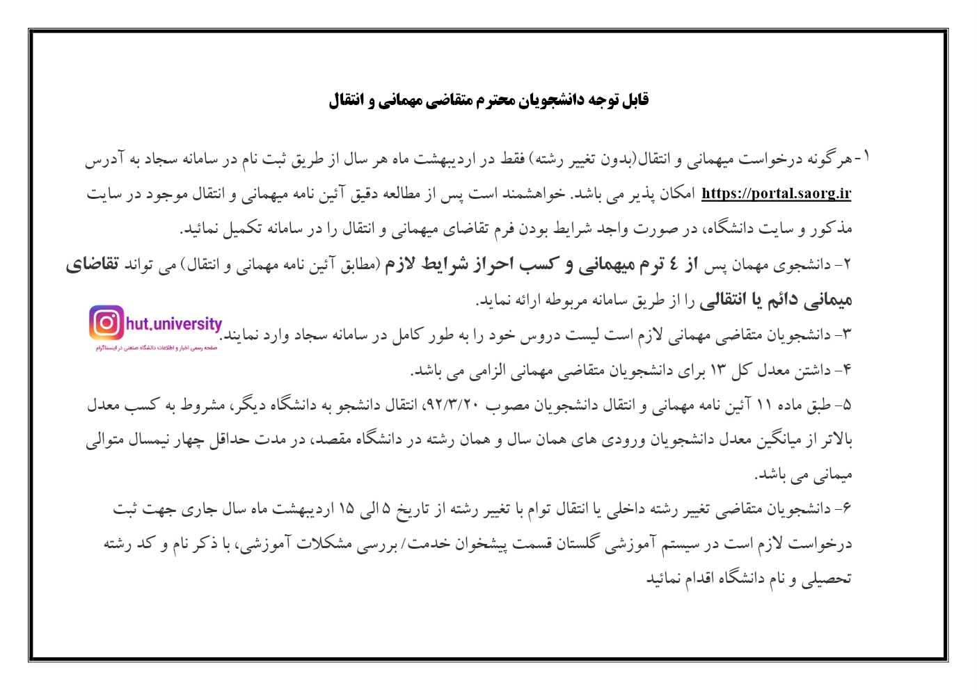 قابل توجه دانشجویان محترم متقاضی مهمانی و انتقال