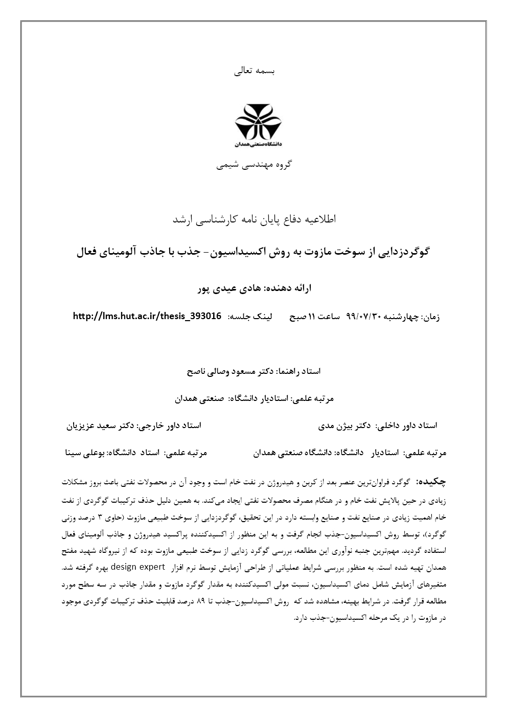 اطلاعیه دفاع دانشجوی کارشناسی ارشد _ هادی عیدی پور