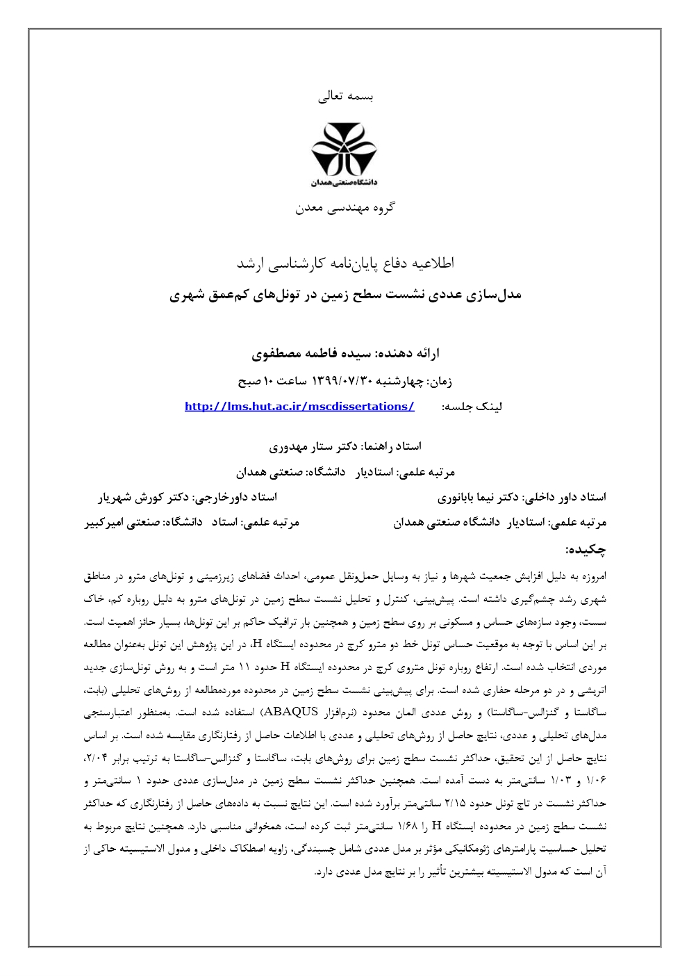 اطلاعیه دفاع دانشجوی کارشناسی ارشد _ سیدهفاطمه مصطفوی
