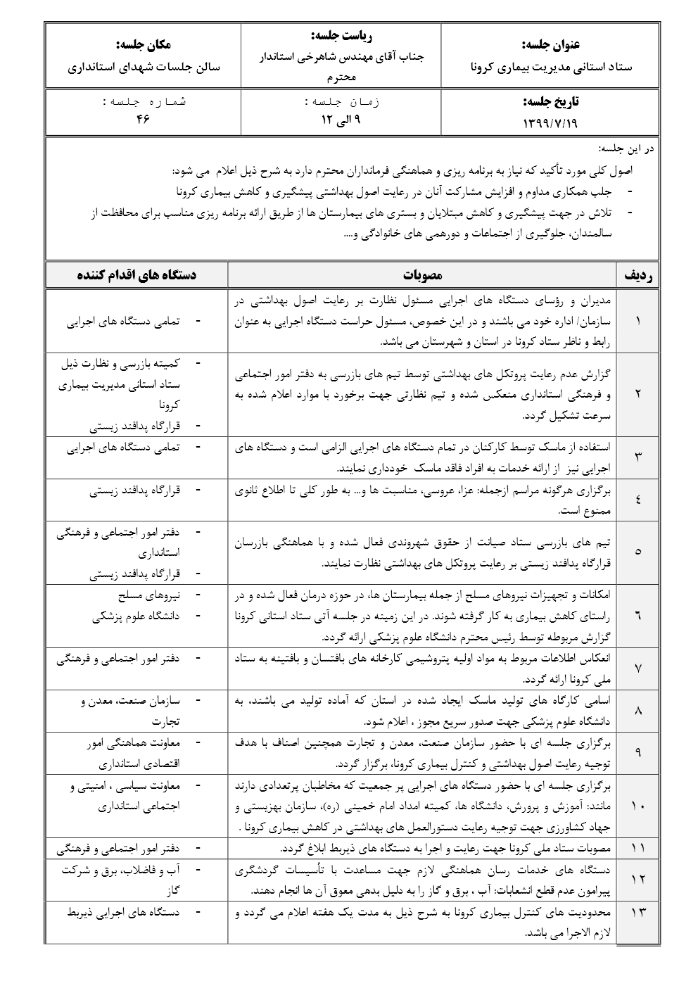 تمدید محدودیت های اعلام شده- مصوبه ۱۳ چهل و ششمین صورتجلسه ستاد کرونا