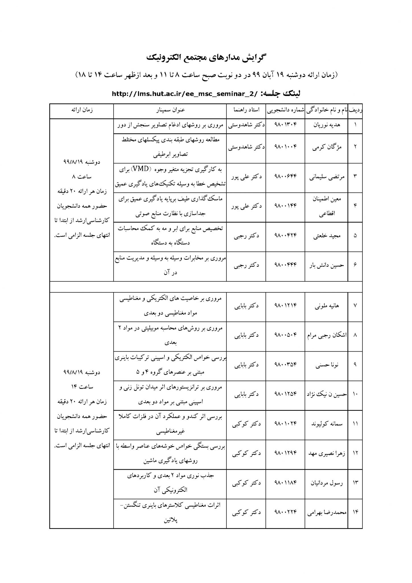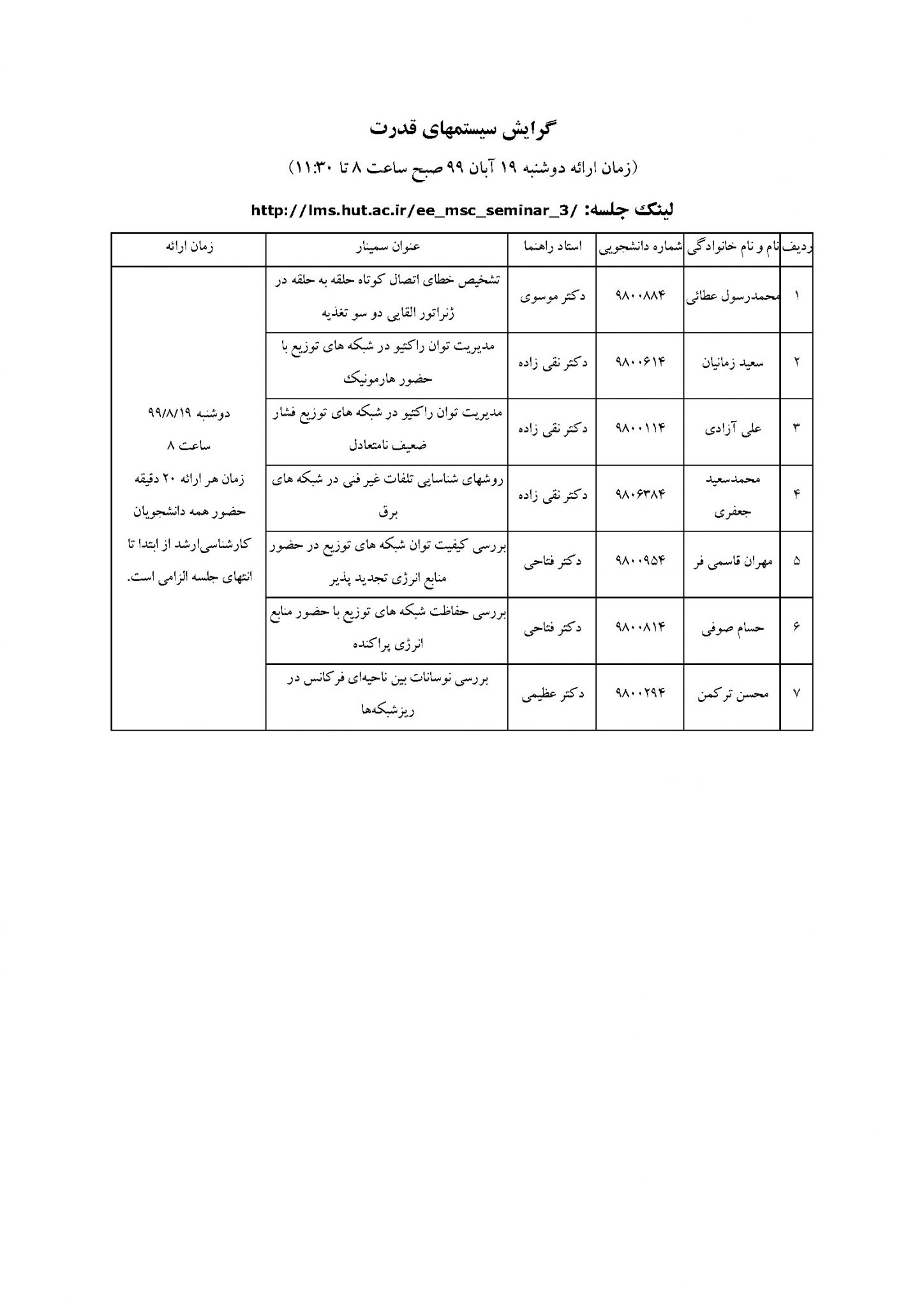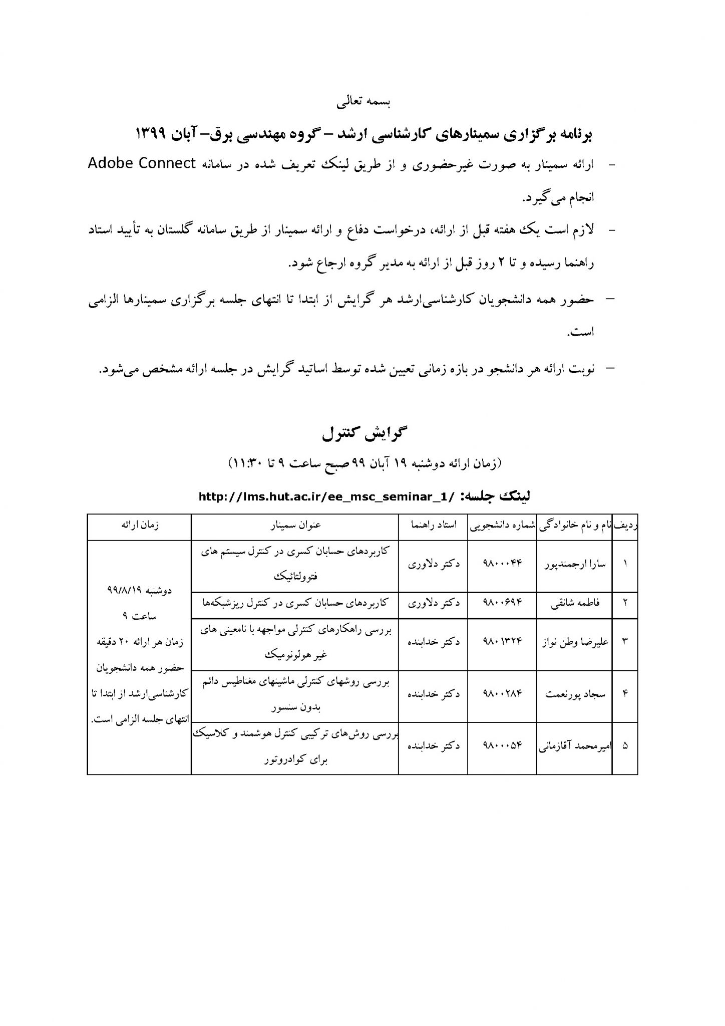 اطلاعیه سمینارهای کارشناسی ارشد گروه مهندسی برق آبان ۹۹
