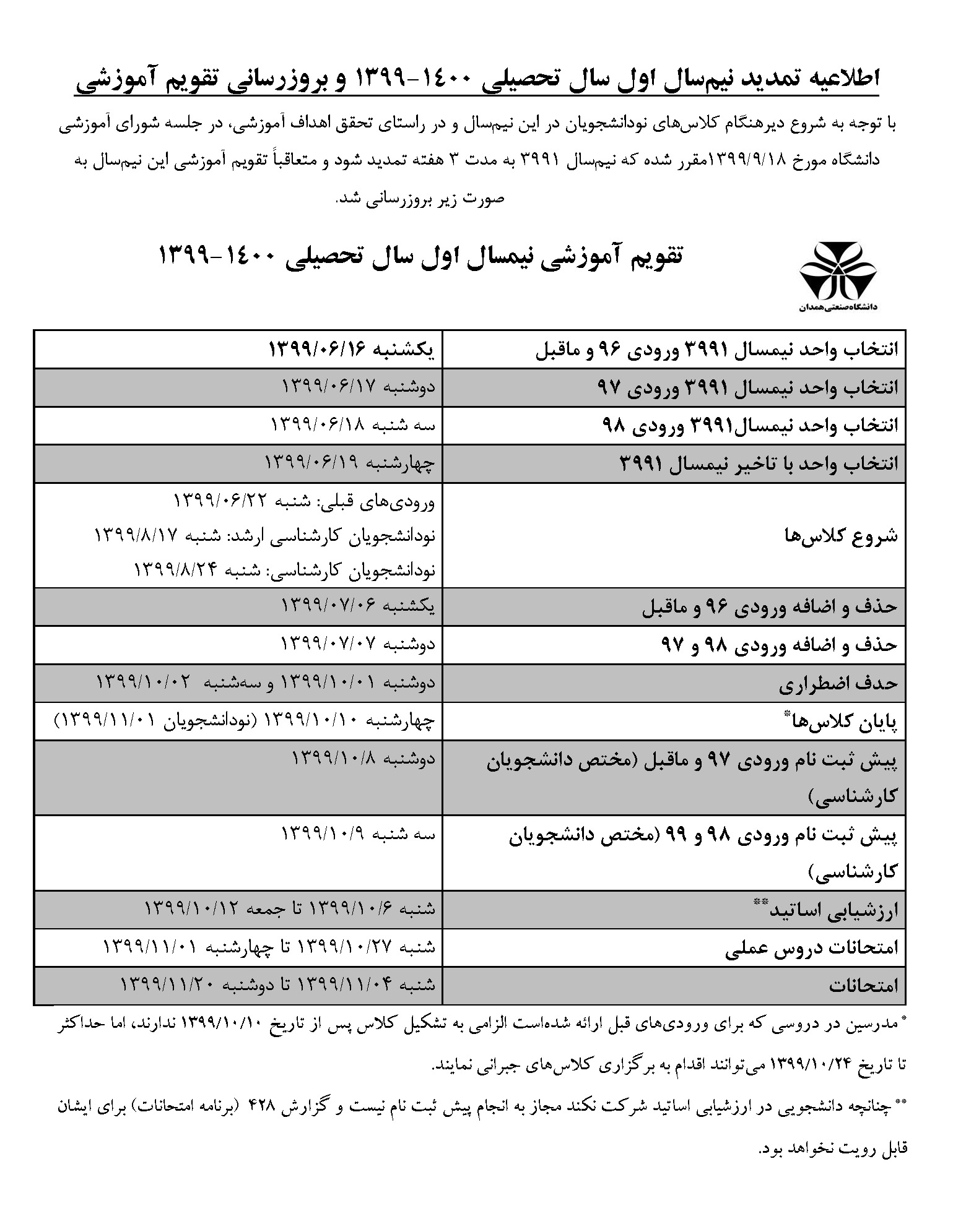 اطلاعیه تمدید نیمسال اول سال تحصیلی ۱۴۰۰-۱۳۹۹ و بروزرسانی تقویم آموزشی