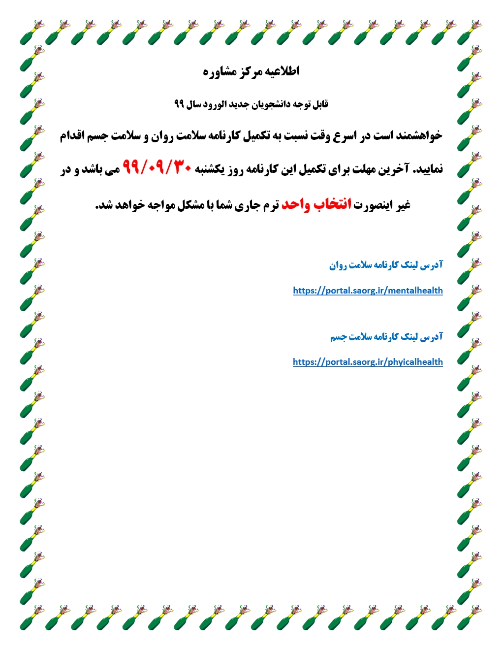 یادآوری به نو دانشجویان جهت تکمیل کارنامه سلامت روان و جسم