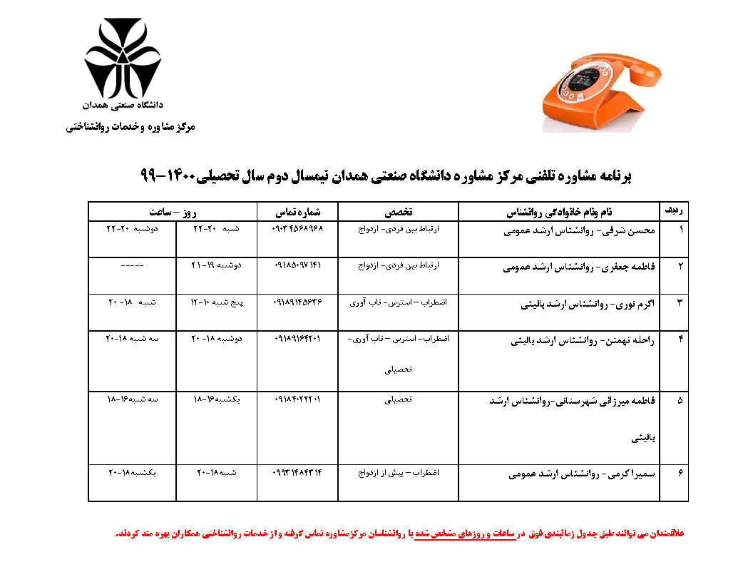 برنامه مشاوره تلفنی دانشگاه صنعتی همدان در نیم سال دوم