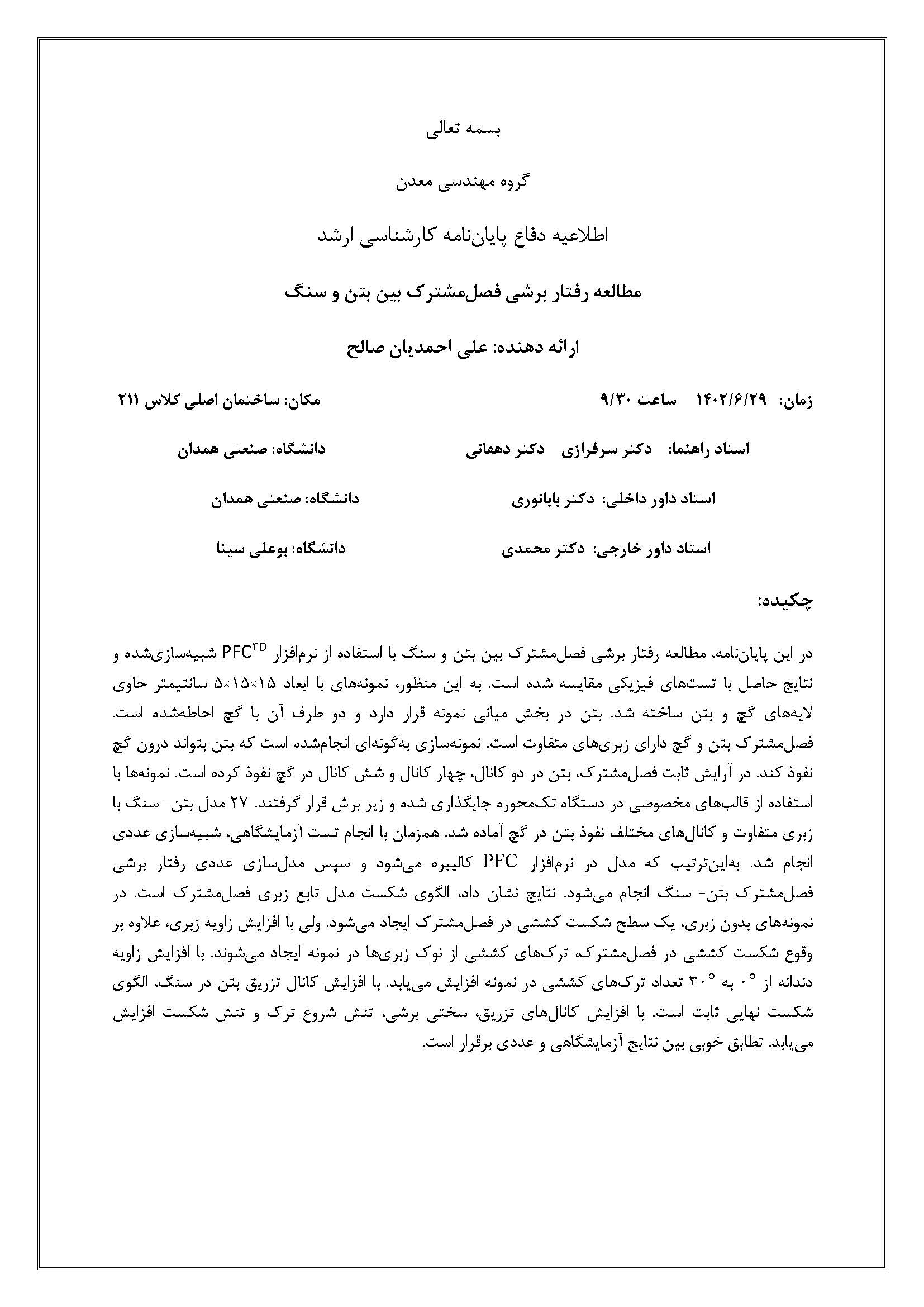 اطلاعیه دفاع دانشجوی کارشناسی ارشد - علی احمدیان صالح