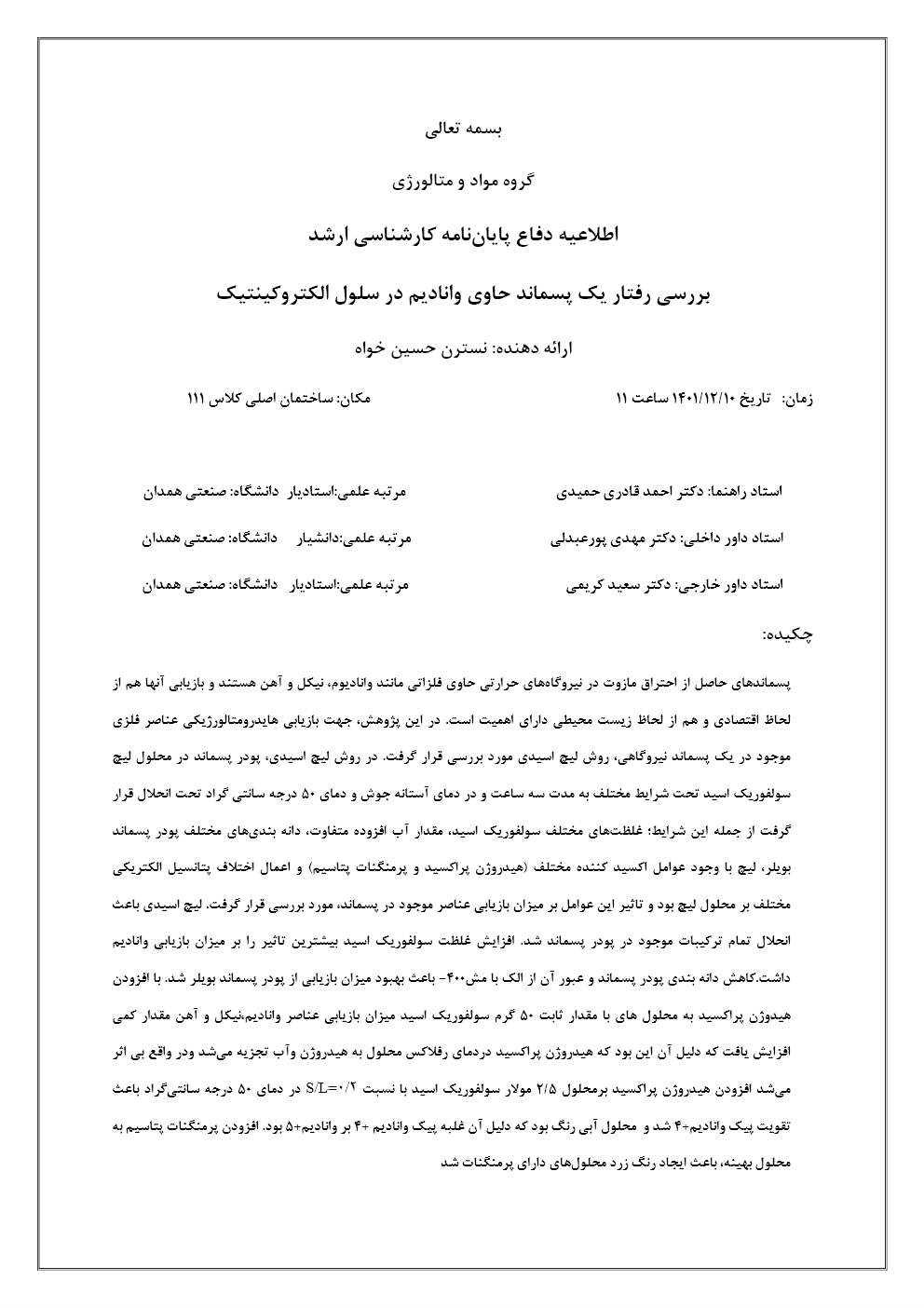اطلاعیه دفاع دانشجوی کارشناسی ارشد - حسین خواه