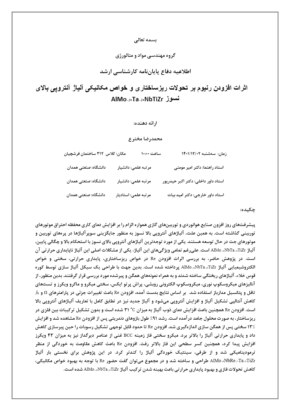 اطلاعیه دفاع دانشجوی کارشناسی ارشد - محمدرضا مخترع