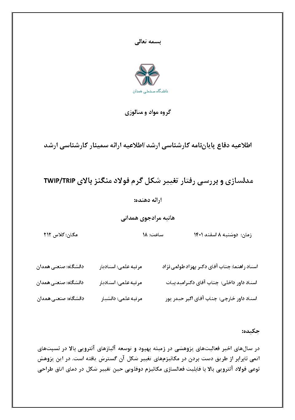 اطلاعیه دفاع دانشجوی کارشناسی ارشد -هانیه مرادجوی همدانی