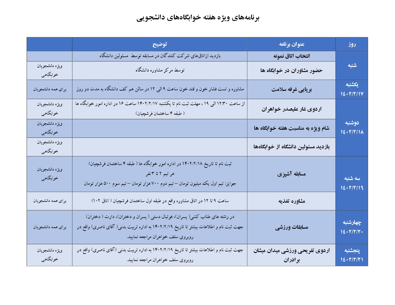 اطلاعیه برنامه های هفته خوابگاه های دانشجوئی