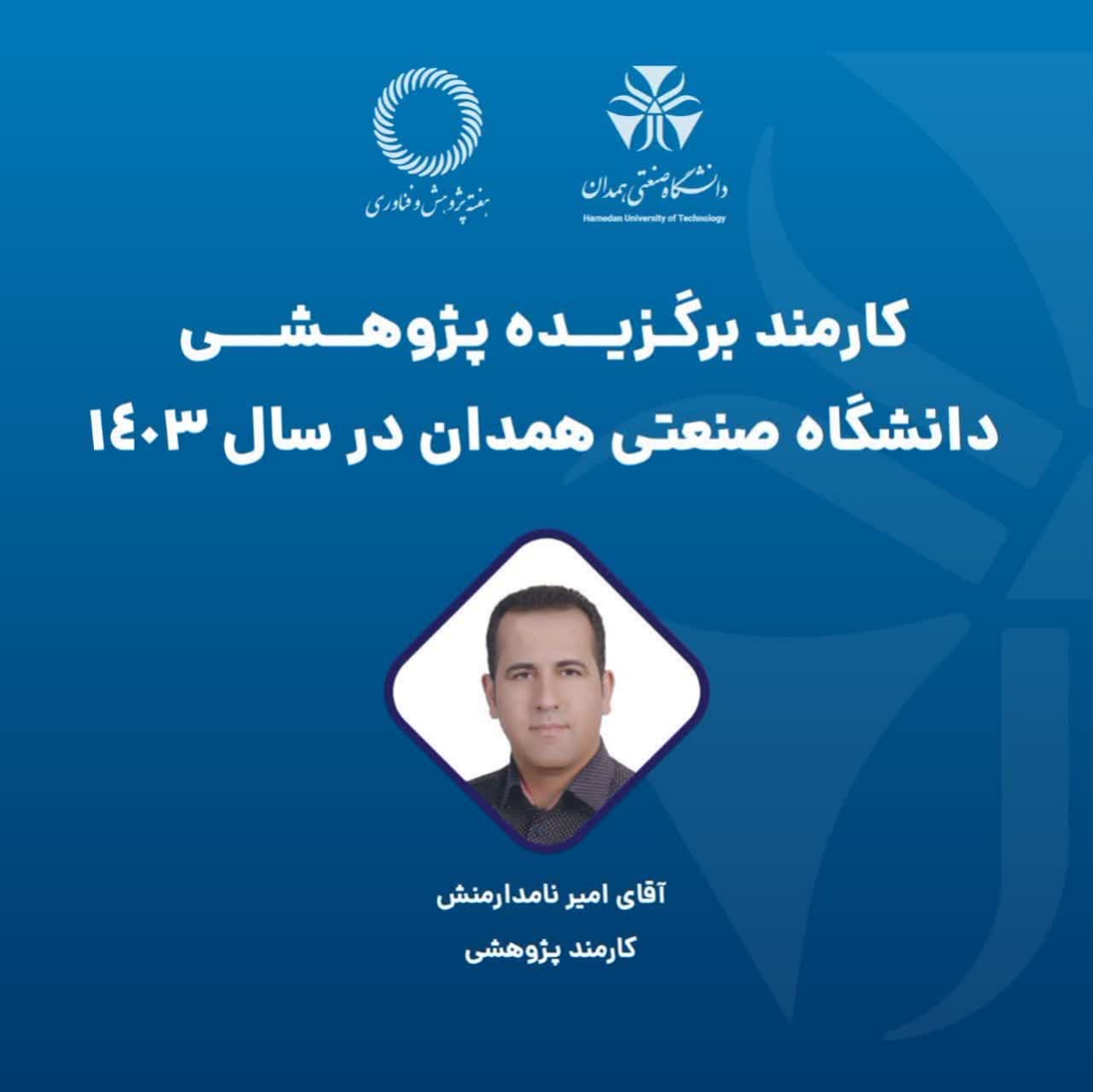 به گزارش روابطعمومی دانشگاه صنعتی همدان، امیر نامدارمنش به عنوان کارمند برگزیده پژوهشی دانشگاه در هفته پژوهش سال ۱۴۰۳ معرفی شد.