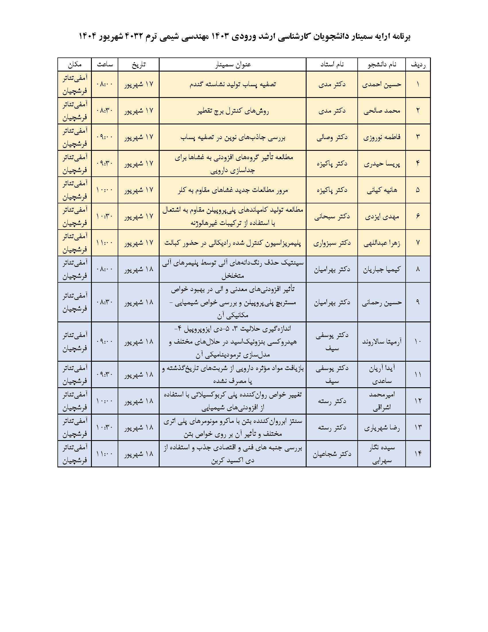برنامه ارایه سمینار دانشجویان ارشد مهندسی شیمی