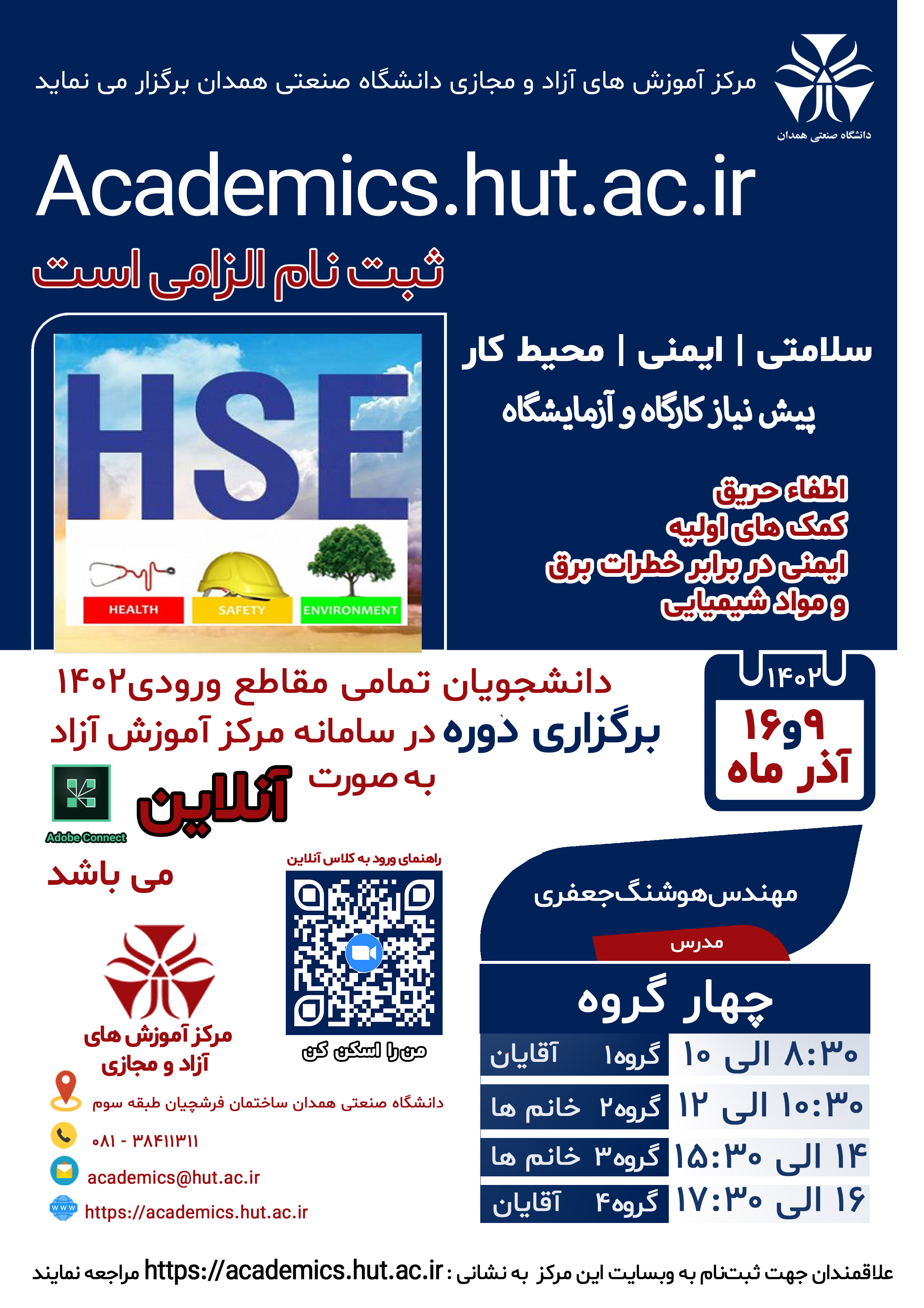 "به اطلاع دانشجویان گرامی میرساند دوره آموزشی HSE، روزهای 5 شنبه در تاریخهای 9و 16 آذر ماه به صورت مجازی از طریق سامانه مرکز آموزش آزاد و مجازی به آدرس https://academics.hut.ac.ir/ برگزار خواهد شد. این دوره در 4 گروه ارائه و پیشنیاز دروس آزمایشگاهی و کارگاهی می باشد. مهلت ثبت نام تا پایان وقت اداری روز چهارشنبه مورخ 8 آذر میباشد. برای کسب اطلاعات بیشتر به سامانه فوق مراجعه نمائید.