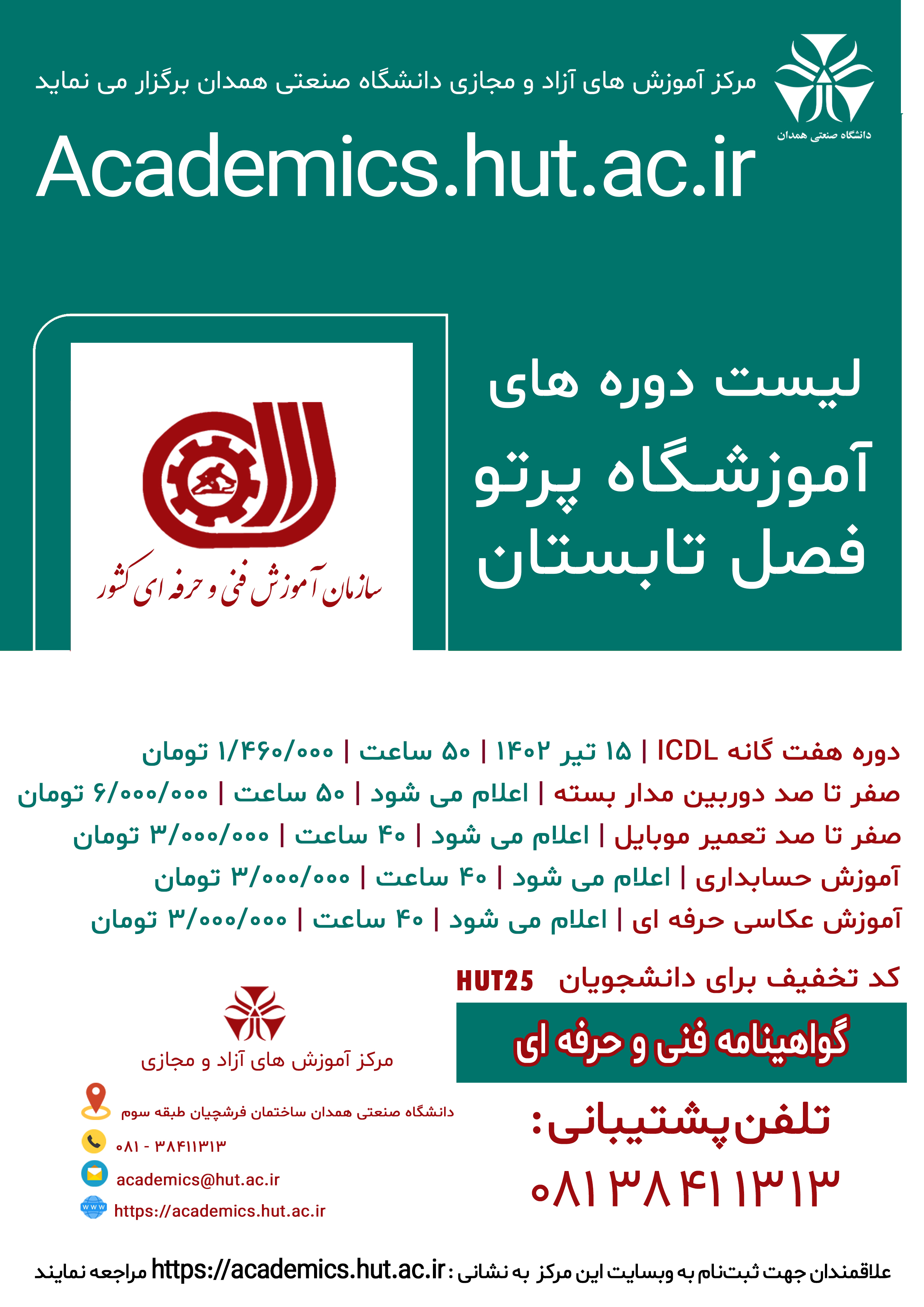 مرکز آموزش های آزاد و مجازی با همکاری آموزشگاه پرتو (با ارائه گواهینامه از سازمان فنی و حرفه ای) دوره های آموزشی به شرح ذیل در تابستان 1402 برگزار می نماید. دانشجویان و کارکنان دانشگاه صنعتی همدان می توانند از به ترتیب 25درصد و 20 درصد تخفیف جهت ثبت نام در این دوره ها بهره مند شوند. اطلاعات بیشتر این دوره ها در سایت مرکز آموزش های آزاد و مجازی به آدرس اینترنتی  https://academics.hut.ac.ir  قابل دسترسی است.