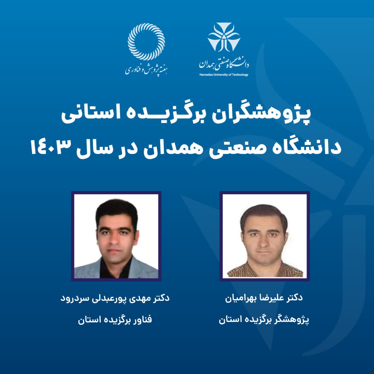 با اعلام ستاد برگزاری هفته پژوهش ۱۴۰۳ استان همدان، دو عضو هیئت علمی دانشگاه صنعتی همدان در لیست پژوهشگران برتر استان قرار گرفتند. به گزارش روابطعمومی دانشگاه صنعتی همدان، مراسم تجلیل از پژوهشگران و فناوران استان همدان در سال ۱۴۰۳ برگزار شد و برگزیدگان و منتخبین استان مورد تجلیل و قدردانی قرار گرفتند. در این مراسم، دکتر علیرضا بهرامیان به عنوان پژوهشگر برتر استان و دکتر مهدی پورعبدلی سردرود به عنوان فناور برگزیده استان معرفی شدند.