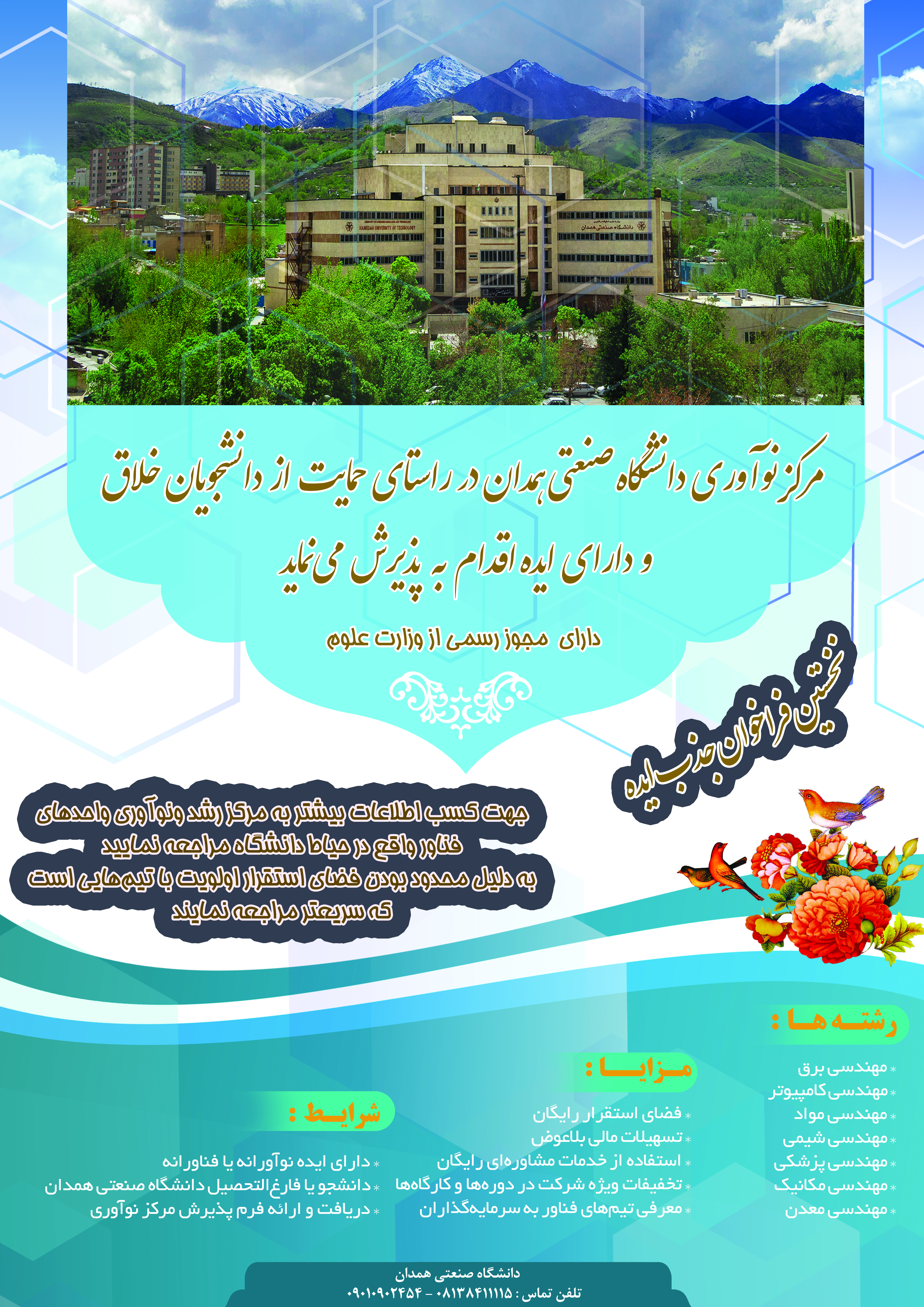 مرکز نوآوری دانشگاه صنعتی همدان در راستای حمایت از دانشجویان دارای ایده اقدام به پذیرش تیم مینماید