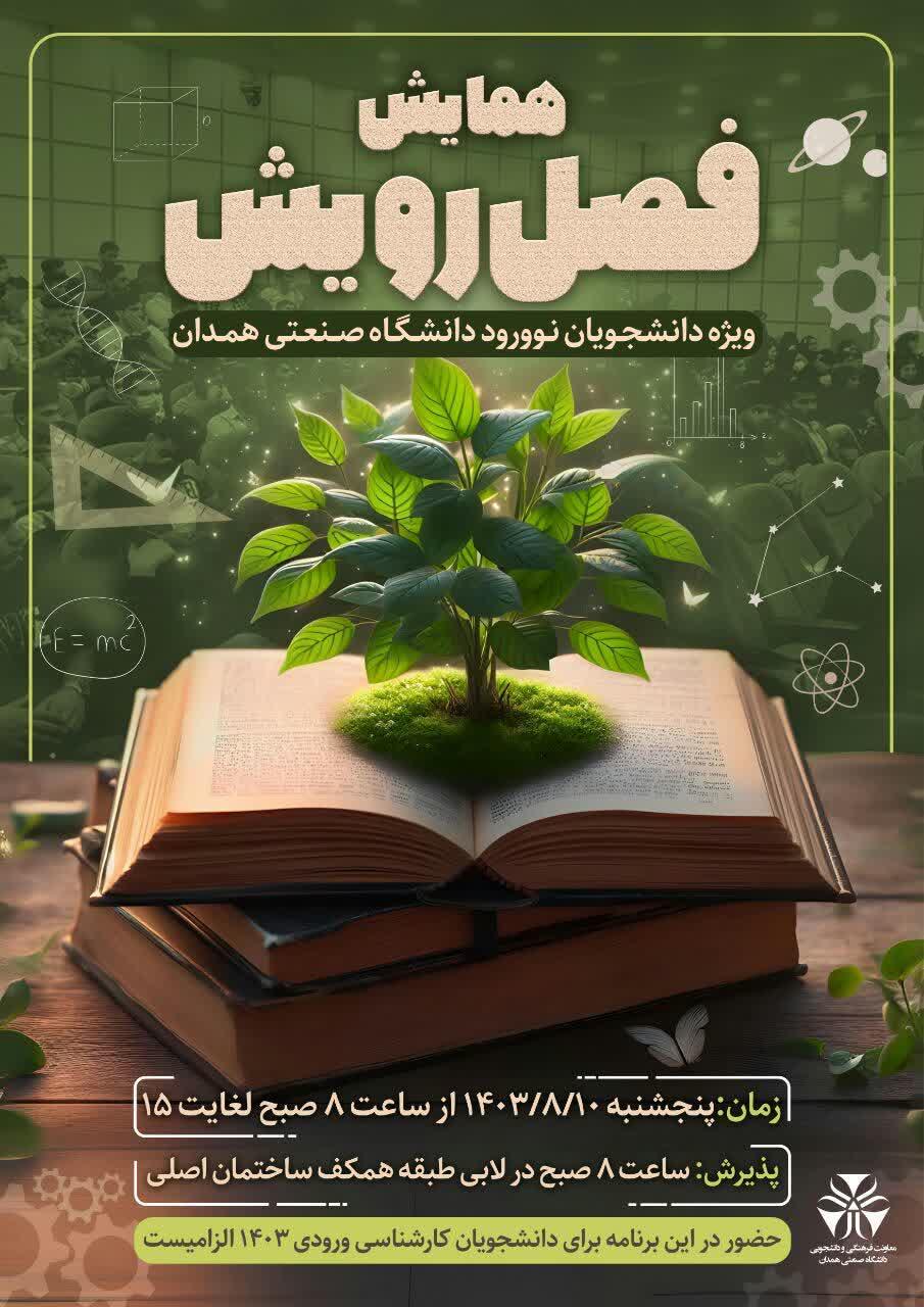 ویژه برنامه دانشجویان نوورود کارشناسی دانشگاه صنعتی همدان با عنوان "فصل رویش" در روز پنجشنبه ۱۰ آبانماه از ساعت ۸ لغایت ۱۵ در دانشگاه برگزار میشود.